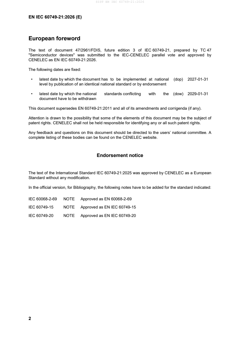 EN IEC 60749-21:2026 is a standard published by CLC. Its full title is "Semiconductor devices - Mechanical and climatic test methods - Part 21: Solderability". This standard covers: IEC 60749-21:2025 establishes a standard procedure for determining the solderability of device package terminations that are intended to be joined to another surface using tin-lead (SnPb) or lead-free (Pb-free) solder for the attachment. This test method provides a procedure for “dip and look” solderability testing of through hole, axial and surface mount devices (SMDs) as well as an optional procedure for a board mounting solderability test for SMDs for the purpose of allowing simulation of the soldering process to be used in the device application. The test method also provides optional conditions for ageing. This test is considered destructive unless otherwise detailed in the relevant specification. NOTE 1 This test method does not assess the effect of thermal stresses which can occur during the soldering process. More details can be found in IEC 60749‑15 or IEC 60749‑20. NOTE 2 If a qualitative test method is preferred, the Wetting balance test method can be found in IEC 60068-2-69. This edition includes the following significant technical changes with respect to the previous edition: - revision to certain operating conditions in line with current working practices.