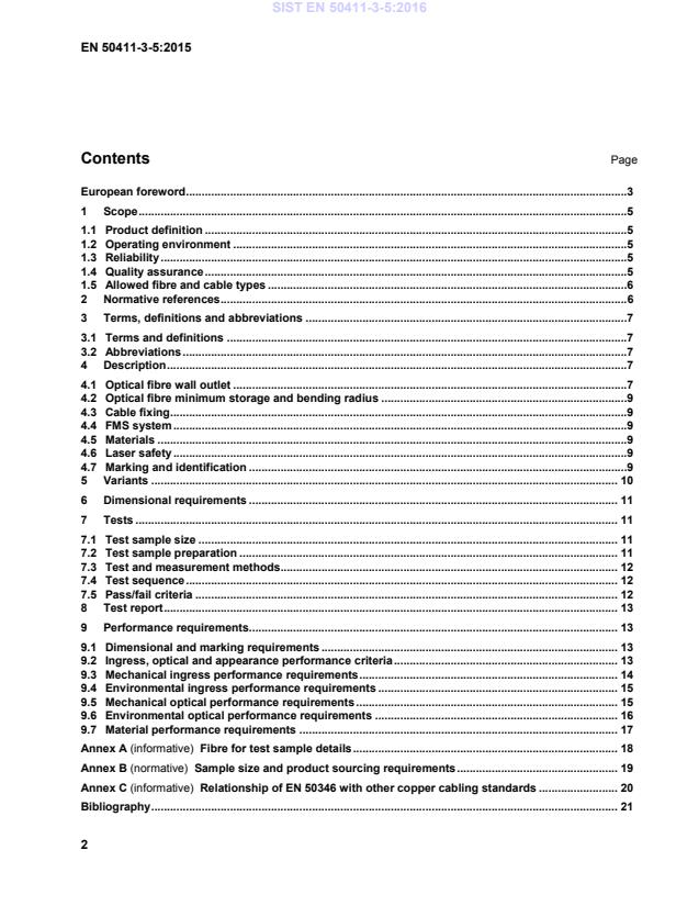 EN 50411-3-5:2015 is a standard published by CLC. Its full title is "Fibre organisers and closures to be used in optical fibre communication systems - Product specifications - Part 3-5: Wall outlet". This standard covers: 1.1 Product definition This European Standard covers wall outlets for up to 4 SC foot-print adapters. Various connector types (e.g. SC, LC) can be implemented as long as the adapter fits in the SC foot-print dimensions. A Wall Outlet is the passive end connection point of a fixed Single Mode fibre based FTTH network to the flexible network of service unit (CPE, ONT) indoor. Products defined by IEV 442-08-02 or IEV 723-09-22 can be considered as Wall Outlets. SI or ENTI are not part of this wall outlet specification. This specification also covers the possibility of using hybrid (fibre/copper) wall outlets with 1 RJ-45 footprint. Performance of copper cabling and connectivity is not in the scope of this document, but should be verified in line with EN 50346. Wall outlets are placed in end user premises by installers and the contents are not intended to be user accessible. Wall outlets may be mounted using a number of techniques: surface mounted on a wall, patress boxes, trunking or raceway; flush mounted or between cable trunking. Cable entry points vary with mounting method: surface mounted or flush mounted boxes may require large holes at the rear of the wall outlet for cable entry requiring little or no strain relief, whereas boxes with cable entry visible to the end user will need cable sealing and strain relief. Wall outlets covered in the product specification will include a fibre management system (FMS) for managing the incoming cables or fibres. The FMS may include trays for splicing pigtails to incoming cable/fibre. This European Standard contains the initial, start of life dimensional, optical, mechanical and environmental performance requirements of an optical fibre wall outlet, in order for it to be categorized as an European Standard product. 1.2 Operating environment The tests selected combined with the severity and duration is representative of indoor environments defined by: EN 61753-1 category C Controlled environment 1.3 Reliability Whilst the anticipated service life expectancy of the product in this environment is 20 years, compliance with this specification does not guarantee the reliability of the product. This should be predicted using a recognized reliability assessment programme. 1.4 Quality assurance Compliance with this specification does not guarantee the manufacturing consistency of the product. This should be maintained using a recognized quality assurance programme. 1.5 Allowed fibre and cable types All EN 60793-2-50 fibres can be stored in the Terminal Equipment Box with a minimum storage radius of 20 mm (up to a storage length of maximum 2 m). Smaller storage radii down to 15 mm are possible with the EN 60793-2-50 B6A fibre types, but in this case the reduction in mechanical reliability should be taken into account (see Annex A). If hybrid cable is used then only the fibre portion is considered in this product specification.