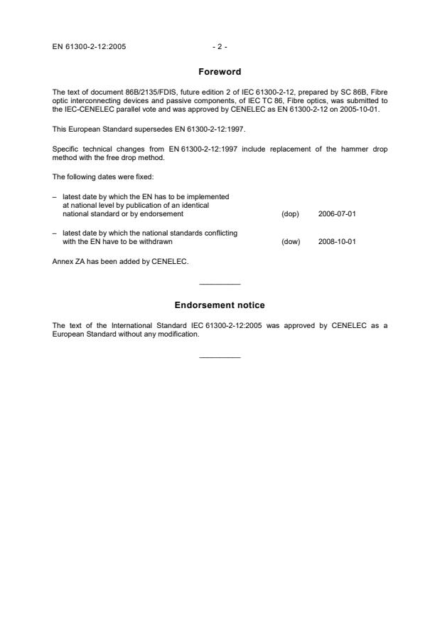 Specific technical changes from EN 61300-2-12:1997 include replacement of the hammer drop