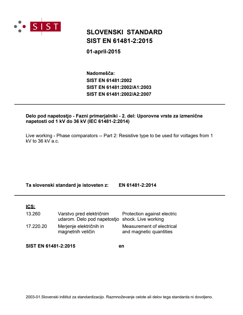 EN 61481-2:2014 (adopted by CLC/CENELEC from IEC 61481-2:2014) specifies requirements for portable resistive phase comparators used for live working on electrical systems from 1 kV to 36 kV a.c. (50/60 Hz). The standard covers phase comparators used in direct contact with bare conductive parts, either as a complete device (including its insulating element) or as a separate indicator adaptable to an insulating stick. It replaces parts of the earlier EN/IEC 61481 editions and introduces technical revisions such as the split into two parts, revised indication requirements, removal of class C, a new "LU" (limited use) marking, and updated test/annex provisions.