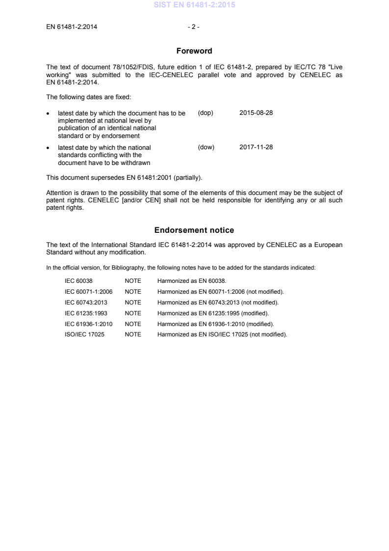 EN 61481-2 references and aligns with related standards such as IEC/EN 60060-1 (high-voltage test techniques), IEC 61318 (conformity assessment for live working tools and equipment) and EMC/environmental standards (IEC 61000 series, IEC 60068). These are relevant when applying EN 61481-2 for design, testing and certification.