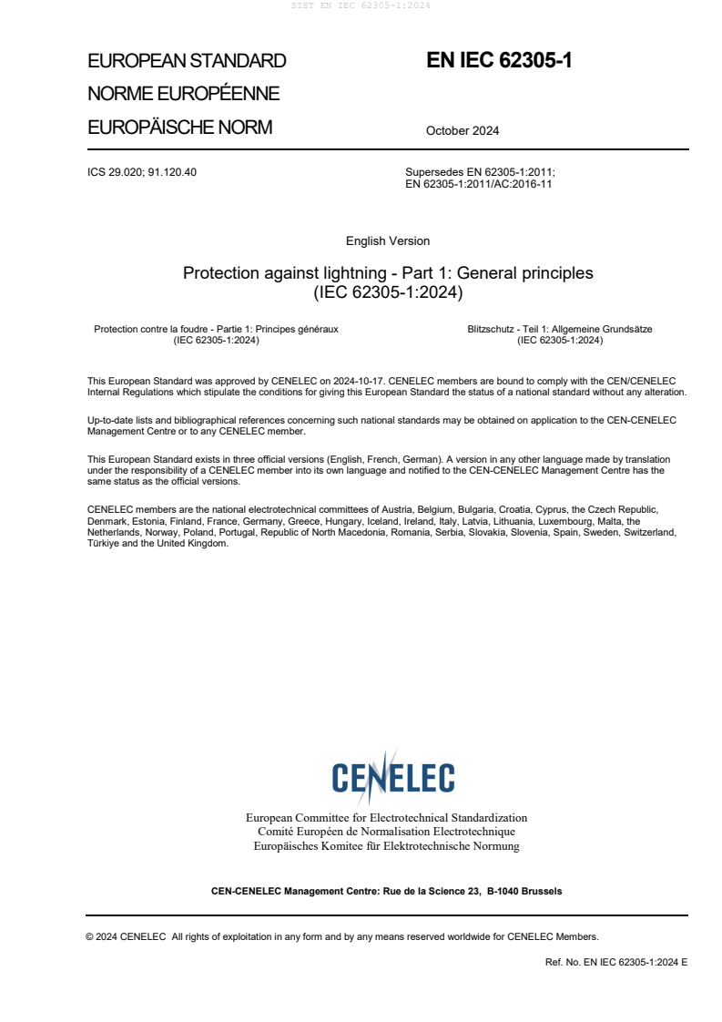 EN IEC 62305-1:2024 - Protection against lightning - Part 1: General principles - establishes the general principles and framework for protecting structures, their contents and people from lightning. This third-edition European adoption of IEC 62305-1 replaces the 2011 version and forms the basis for risk assessment, design and selection of lightning protection systems (LPS) and surge protective measures across buildings and installations (except for specialized domains noted below).