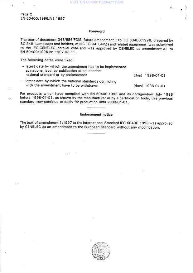 EN 60400:1996/A1:1997 is a amendment published by CLC. Its full title is "Lampholders for tubular fluorescent lamps and starterholders". This standard covers: EN following parallel vote * Superseded by EN 60400:2000