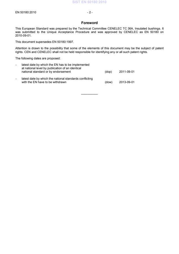 EN 50180:2010 is a standard published by CLC. Its full title is "Bushings above 1 kV up to 52 kV and from 250 A to 3,15 kA for liquid filled transformers – Part 1: General requirements for bushings". This standard covers: This European Standard is applicable to ceramic and resin insulated bushings having highest voltages above 1 kV up to 52 kV, rated currents from 250 A up to 3 150 A and frequencies from 15 Hz up to 60 Hz for insulating liquid filled transformers. This standard establishes essential dimensions, to ensure interchangeability of bushings and to ensure adequate mounting and interchangeability of mating plug-in separable connectors of equivalent ratings.