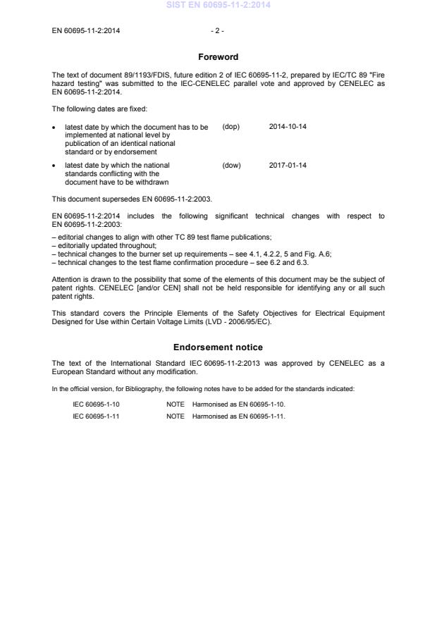 Full information on the voting for the approval of this standard can be found in the report on voting indicated in the above table. This publication has been drafted in accordance with the ISO/IEC Directives, Part 2.This second edition of IEC 60695-11-2 cancels and replaces the first edition published in 2003. It constitutes a technical revision. SIST EN 60695-11-2:2014