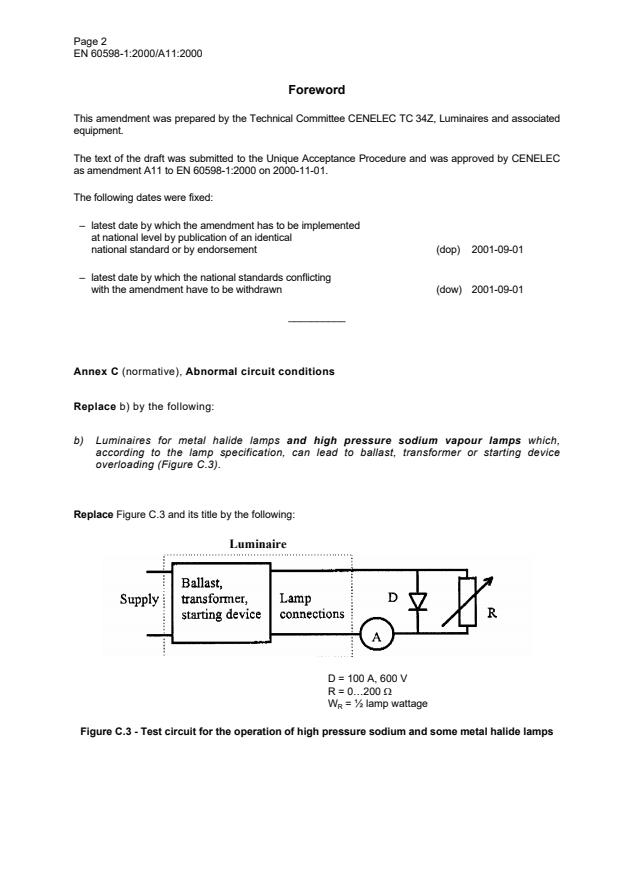 This amendment A11 modifies the European Standard EN 60598-1:2000; it was approved by CENELEC