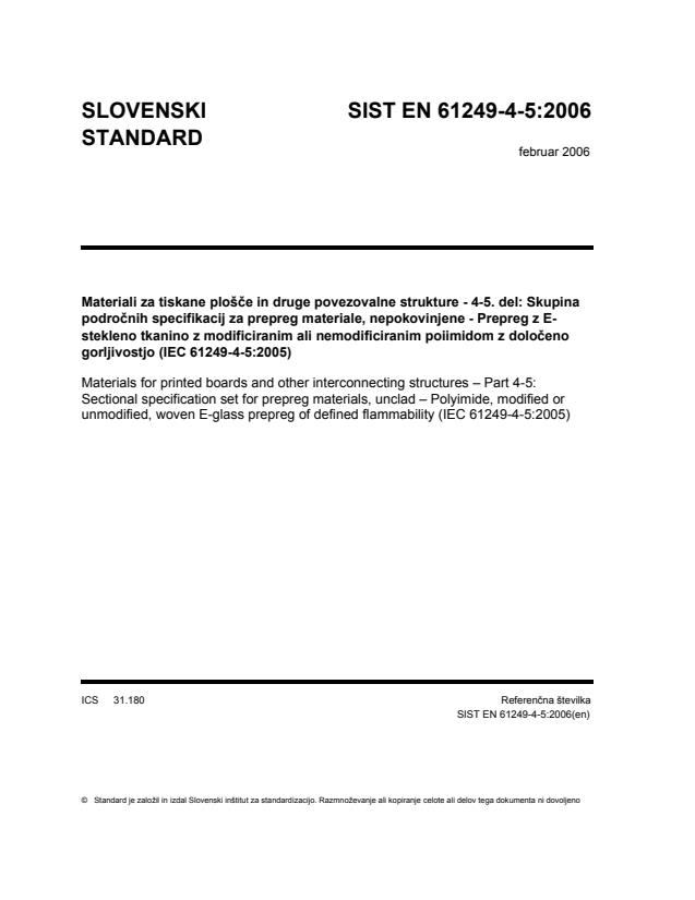 Materiali za tiskane plošče in druge povezovalne strukture - 4-5. del: Skupina področnih specifikacij za prepreg materiale, nepokovinjene - Prepreg z E-stekleno tkanino z modificiranim ali nemodificiranim poiimidom z določeno gorljivostjo (IEC 61249-4-5:2005)