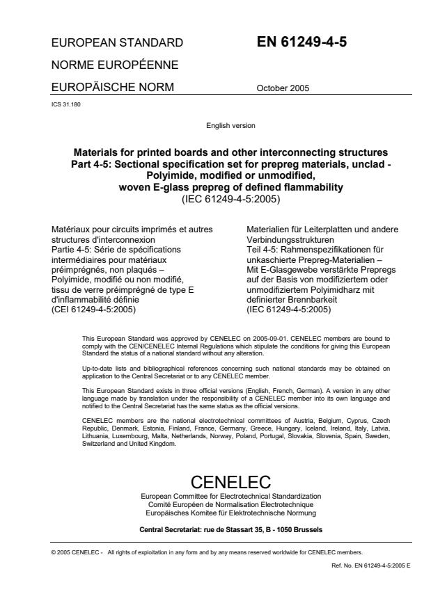 EN 61249-4-5:2005 (IEC 61249-4-5:2005) is a sectional specification for unclad polyimide prepreg reinforced with woven E‑glass and of defined flammability. It specifies material, construction and inspection requirements for prepreg mainly intended as bonding sheets used with laminates (see EN 61249-2-11) when manufacturing rigid multilayer printed boards (EN 62326-4). The standard defines flammability (vertical burning test), the use of brominated fire retardants incorporated in the polymer structure, and minimum glass transition temperature after curing (see Notes below).