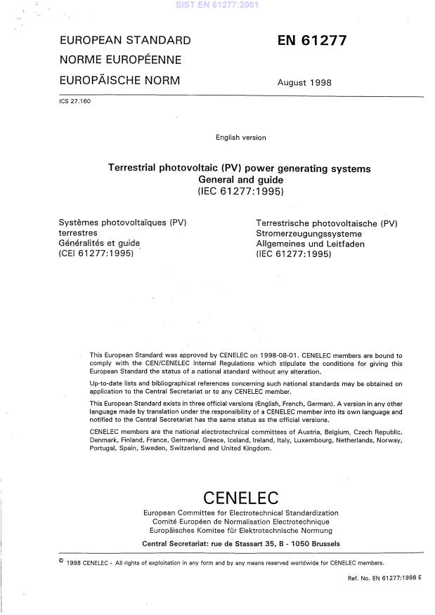 EN 61277:1998 is a standard published by CLC. Its full title is "Terrestrial photovoltaic (PV) power generating systems - General and guide". This standard covers: Gives an overview of terrestrial PV power generating systems and the functional elements of such systems.