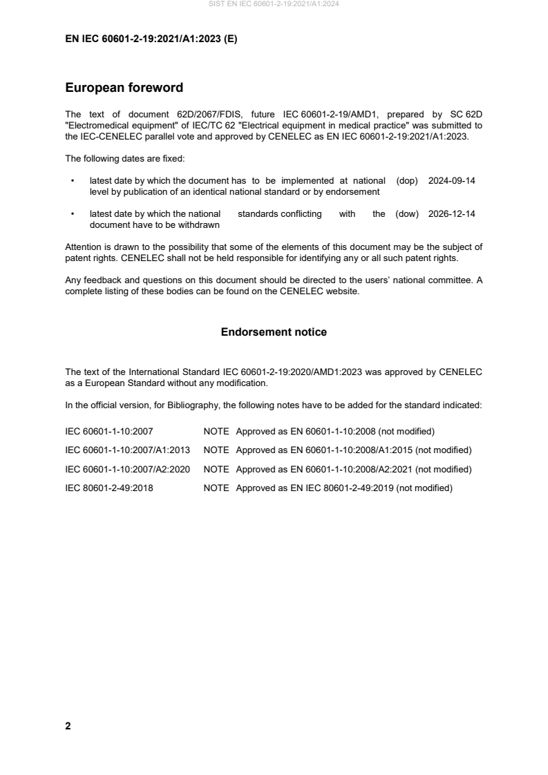 This amendment A1 modifies the European Standard EN IEC 60601-2-19:2021; it was approved by CENELEC on 2023-12-14. CENELEC