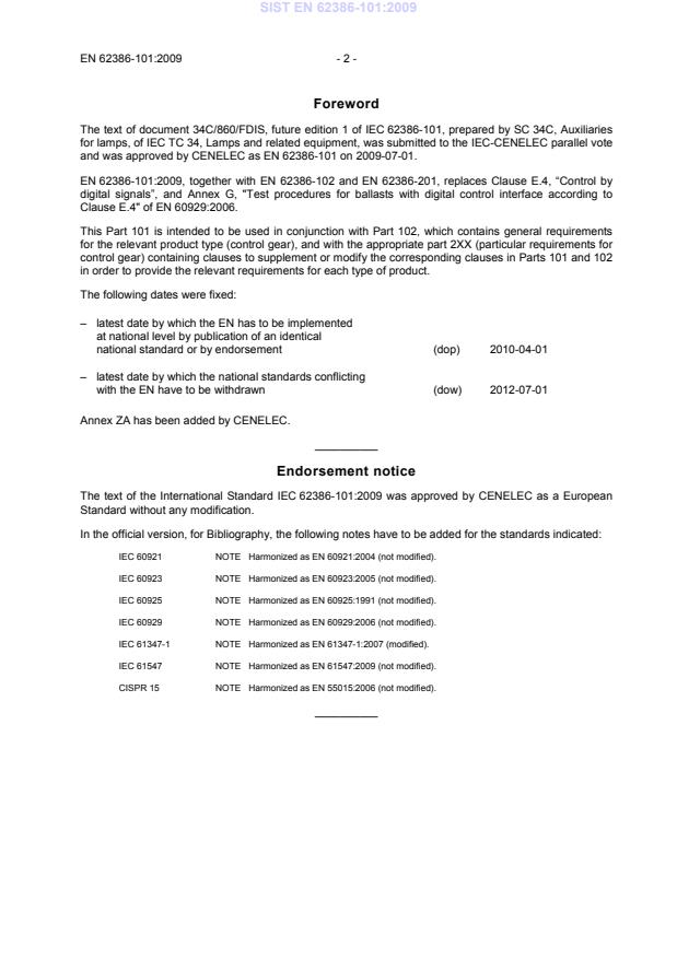 2012-07-01 Annex ZA has been added by CENELEC. __________ Endorsement notice The text of the International Standard IEC 62386-101:2009 was approved by CENELEC as a European Standard without any modification. In the official version, for Bibliography, the following notes have to be added for the standards indicated: IEC 60921 NOTE