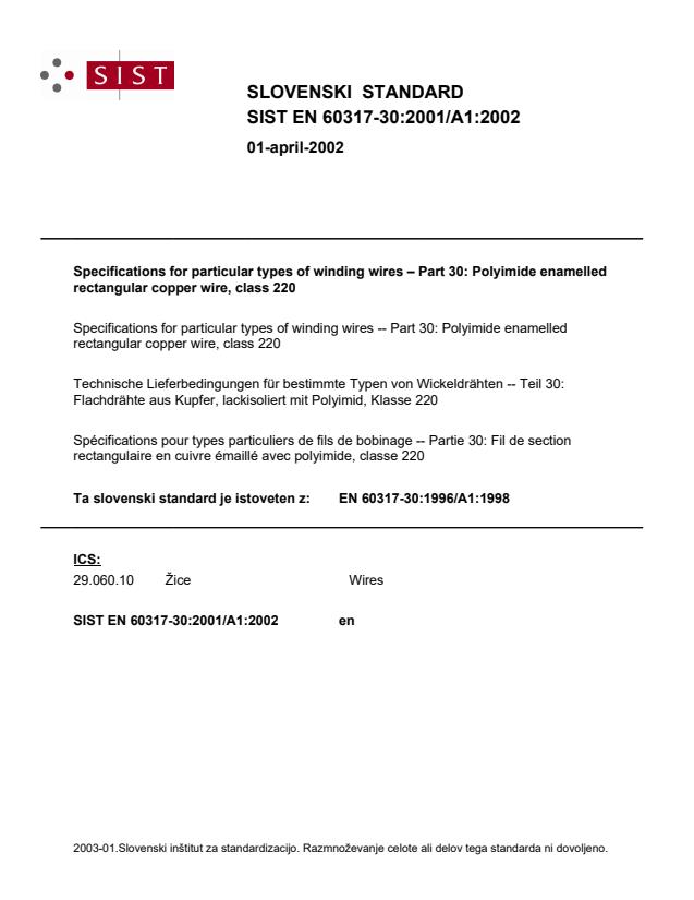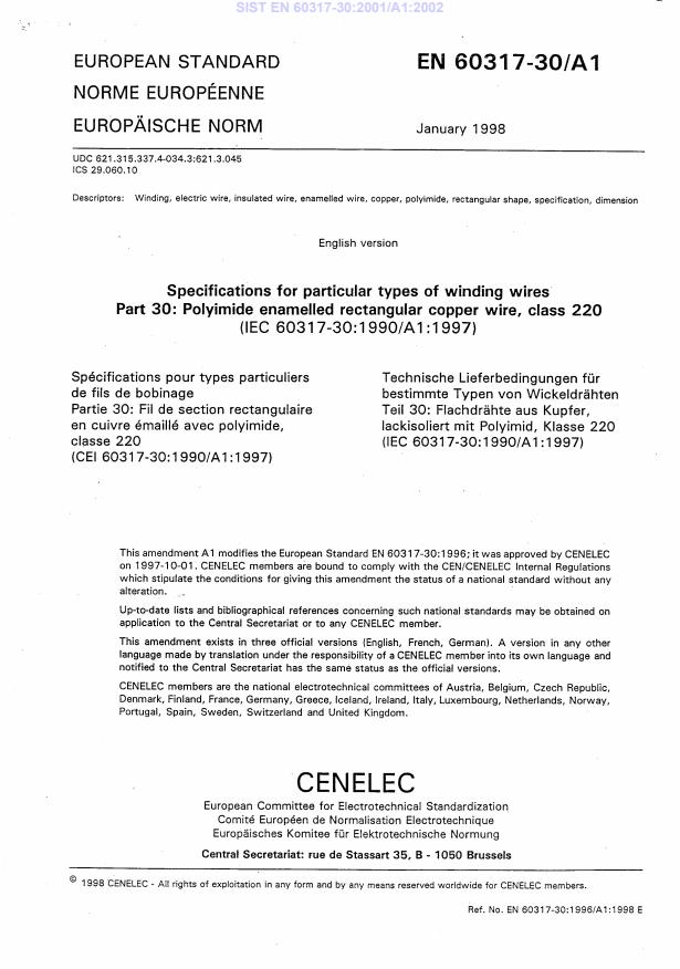 EN 60317-30:1996/A1:1998 is a amendment published by CLC. Its full title is "Specifications for particular types of winding wires - Part 30: Polyimide enamelled rectangular copper wire, class 220". This standard covers: EN following parallel vote * D134/127: Withdrawal vote (further to withdrawal of IEC 60317-30:1990)