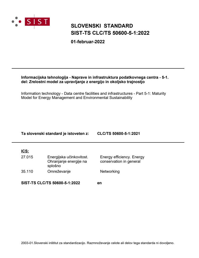 Ta slovenski standard je istoveten z: CLC/TS 50600-5-1:2021
