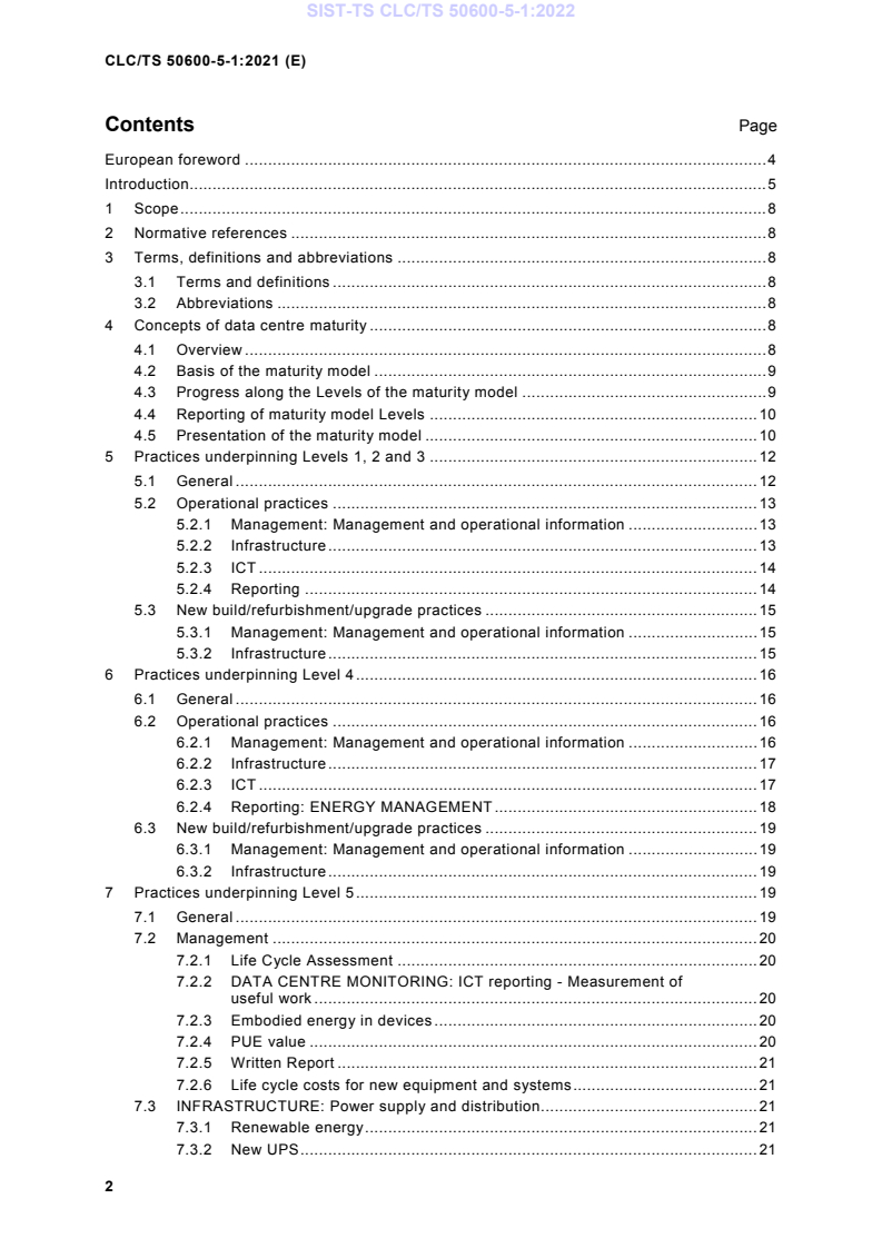 CLC/TS 50600-5-1:2021 is a technical specification published by CLC. Its full title is "Information technology - Data centre facilities and infrastructures - Part 5-1: Maturity Model for Energy Management and Environmental Sustainability". This standard covers: This document provides a maturity model addressing the environmental impact (energy management and environmental sustainability) of the facilities, infrastructures and the information and communication technology (ICT) equipment accommodated by the data centre. NOTE The term "environmental sustainability" is used recognizing that well established treatments of "sustainability" feature three separate viability objectives (environmental, economic and social). For the purposes of this document, only elements of environmental viability are considered. The elements addressed include design, procurement, operation and end-of-life. The achievement of the Levels of the maturity model are based upon confirmation of the implementation of applicable practices of CLC/TR 50600-99-1 and CLC/TR 50600-99-2.