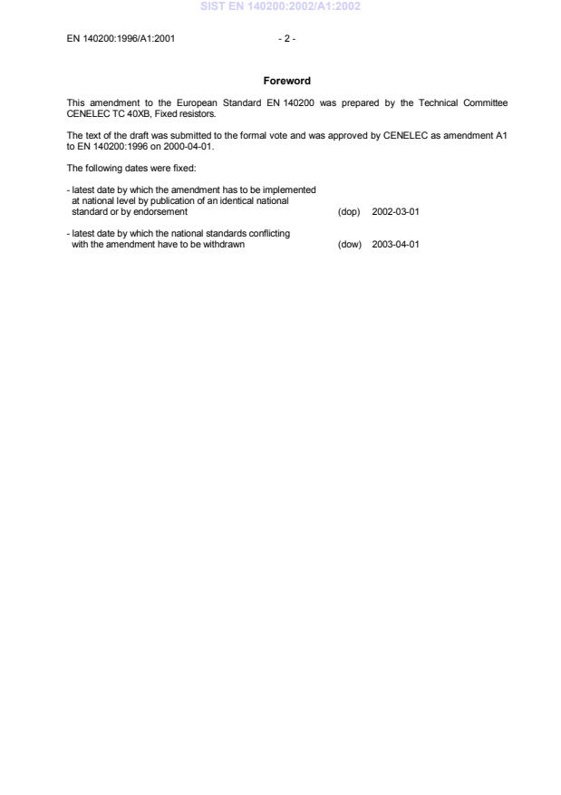 EN 140200:1996/A1:2001 is a amendment published by CLC. Its full title is "Sectional Specification: Fixed power resistors". This standard covers: 2021: CLC legacy converted by DCLab NISOSTS