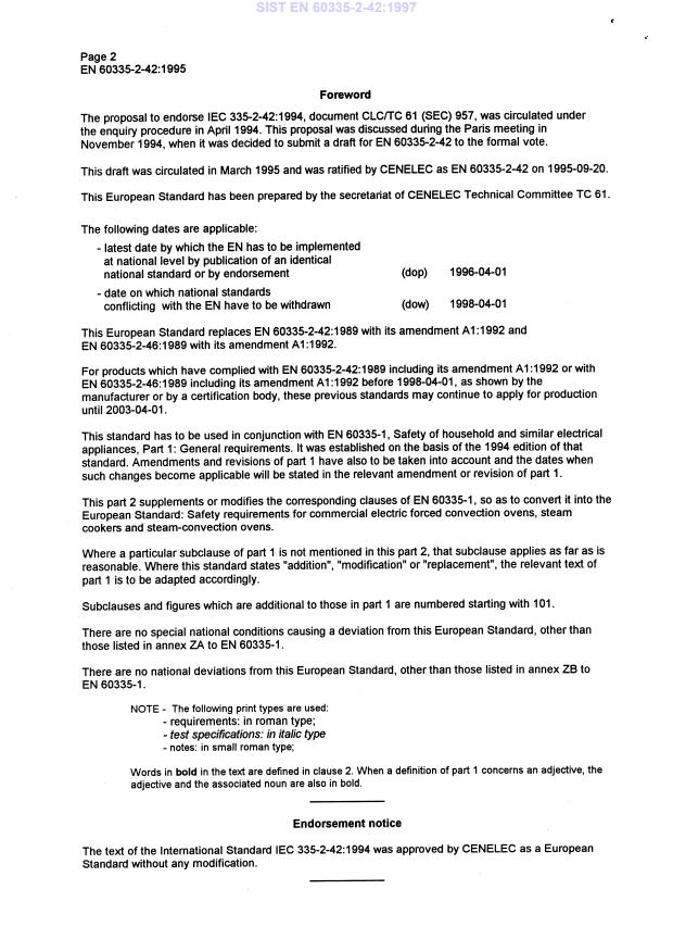 2003-01.Slovenski inštitut za standardizacijo. Razmnoževanje celote ali delov tega standarda ni dovoljeno.Safety of household and similar electrical appliances - Part 2: Particular requirements for commercial electric forced convection ovens, steam cookers and steam-convection ovens (IEC 335-2-42:1994)Sicherheit elektrischer Geräte für den Hausgebrauch und ähnliche Zwecke -- Teil 2-42: Besondere Anforderungen für elektrische Heißumluftöfen, Dämpfgeräte und Heißluftdämpfer für den gewerblichen GebrauchSécurité des appareils électrodomestiques et analogues -- Partie 2-42: Règles particulières pour les fours électriques à convection forcée, les cuiseurs à vapeur électriques et les fours combinés vapeur-convection électriques à usage collectifSafety of household and similar electrical appliances -- Part 2-42: Particular requirements for commercial electric forced convection ovens, steam cookers and steam-convection ovens97.040.20Cooking ranges, working tables, ov