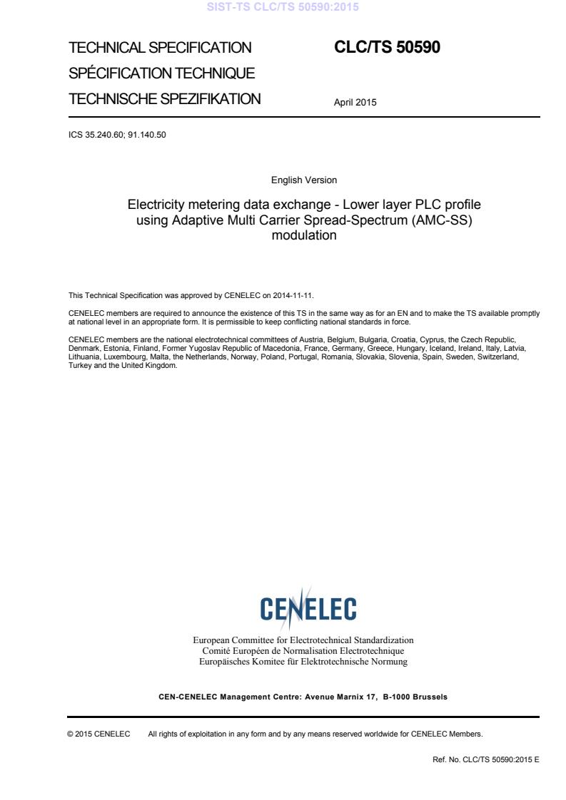 CLC/TS 50590:2015 - Electricity metering data exchange - Lower layer PLC profile using Adaptive Multi-Carrier Spread-Spectrum (AMC‑SS) modulation - specifies a lower‑layer profile for power line communication (PLC) on CX1 networks. Published by CENELEC, this Technical Specification defines the physical (PHY) layer, medium access control (MAC) sub‑layer, and logical link control (LLC) sub‑layer for communications between a master node and one or more slave nodes over the electrical distribution network. The PHY is optimized for the CENELEC A band (3 kHz–95 kHz) and uses AMC‑SS modulation to provide robust links in the presence of narrowband interference, impulsive noise and frequency‑selective attenuation.