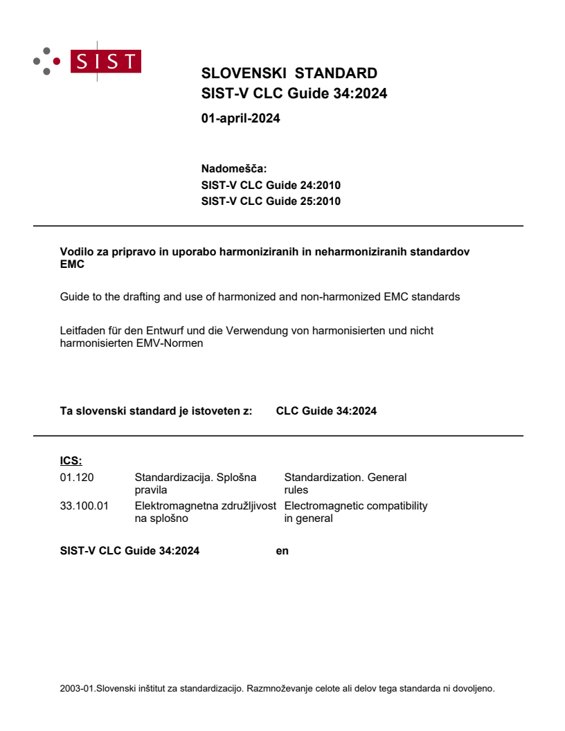 CLC Guide 34:2024 is a guide published by CLC. Its full title is "Guide to the drafting and use of harmonized and non-harmonized EMC standards". This standard covers: This CENELEC Guide establishes useful guidelines for the preparation and use of standards in the field of electromagnetic compatibility (EMC) in general, and in particular for the implementation of the EMC Directive and the Radio Equipment Directive (RED). This Guide is intended to be used by Technical Committees. The purpose of this guide is to give advice on: - the preparation of dedicated Product and Product Family Standards; - the application of EMC Standards. Certification aspects are not covered by this Guide. NOTE Certification is the action by a third party demonstrating that adequate confidence is provided that a duly identified product, process or service is in conformity with a standard or with other normative documents.