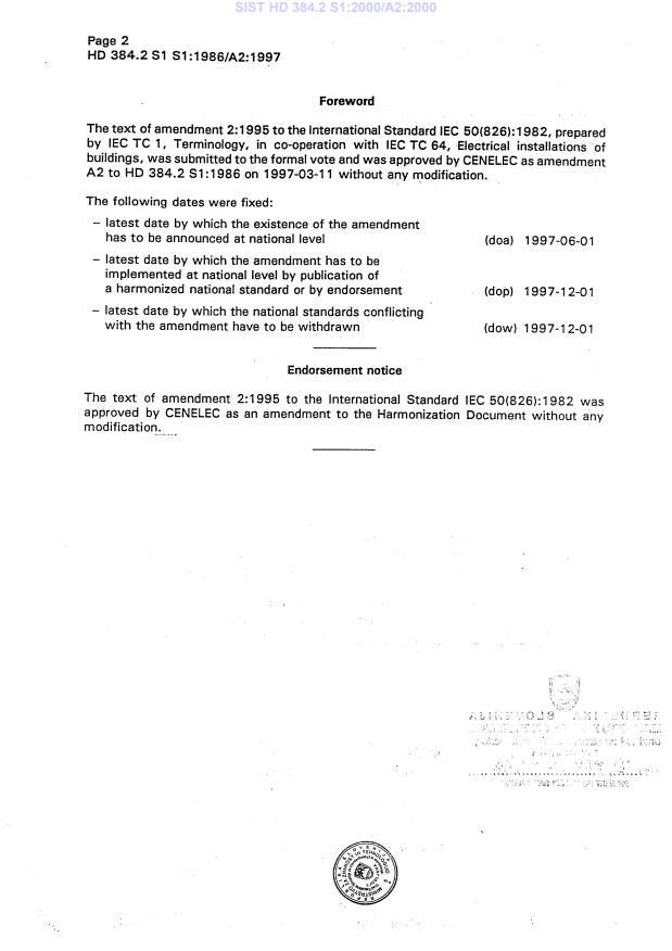 HD 384.2 S1:1986/A2:1997 is a amendment published by CLC. Its full title is "International electrotechnical vocabulary - Chapter 826: Electrical installations of buildings". This standard covers: Superseded by HD 384.2 S2:2001