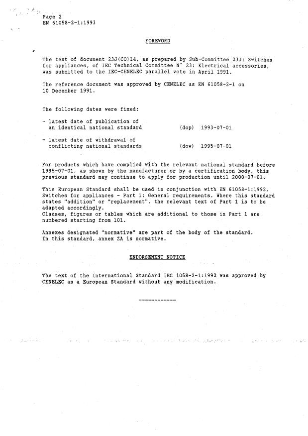 EN 61058-2-1:1993 is a standard published by CLC. Its full title is "Switches for appliances - Part 2-1: Particular requirements for cord switches". This standard covers: Applies to cord switches for appliances actuated by hand, by foot or by other human activity for use in, on or with appliances and other equipment for household and similar purposes, with a rated voltage not exceeding 250 V and a rated current not exceeding 16 A.
