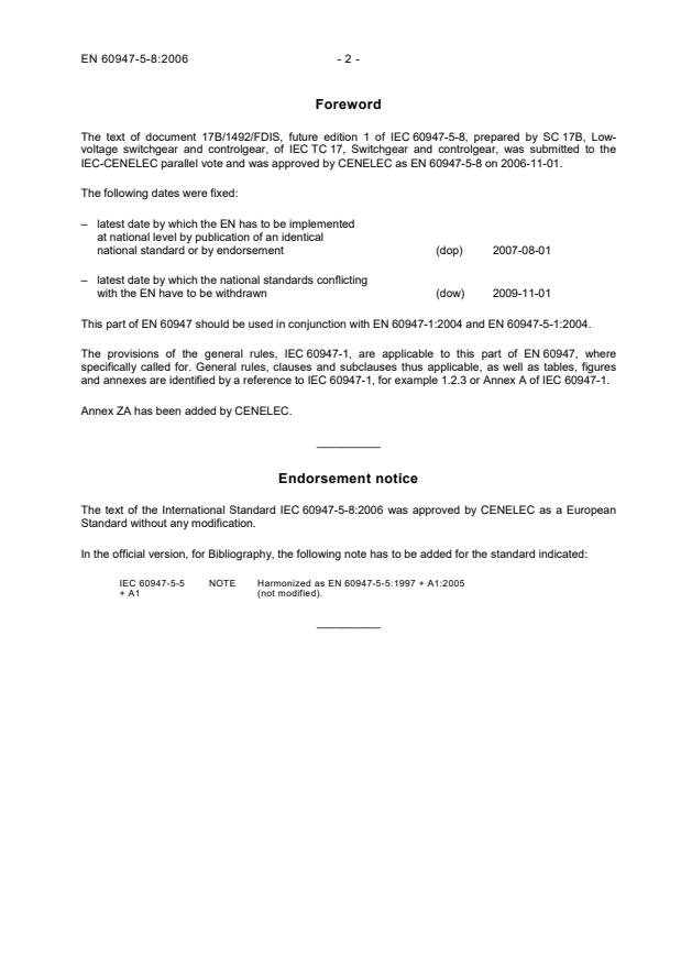 Annex ZA has been added by CENELEC. __________ Endorsement notice The text of the International Standard IEC 60947-5-8:2006 was approved by CENELEC as a European Standard without any modification. In the official version, for Bibliography, the following note has to be added for the standard indicated: IEC 60947-5-5 + A1 NOTE Harmonized as EN 60947-5-5:1997 + A1:2005