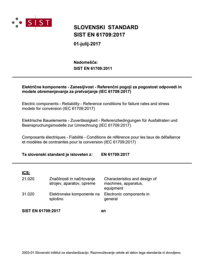 Električne komponente - Zanesljivost - Referenčni pogoji za pogostost odpovedi in modele obremenjevanja za pretvarjanje (IEC 61709:2017)