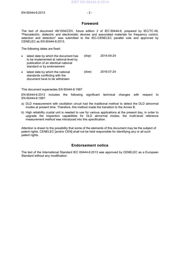EN 60444-6:2013 is a standard published by CLC. Its full title is "Measurement of quartz crystal unit parameters - Part 6: Measurement of drive level dependence (DLD)". This standard covers: IEC 60444-6:2013 applies to the measurements of drive level dependence (DLD) of quartz crystal units. Two test methods and one referential method are described. This edition includes the following significant technical changes with respect to the previous edition: a) DLD measurement with oscillation circuit had the traditional method to detect the DLD abnormal modes at present time. Therefore, this method made the transition to the Annex B. b) High reliability crystal unit is needed to use for various applications at the present day, in order to upgrade the inspection capabilities for DLD abnormal modes, the multi-level reference measurement method was introduced into this specification.