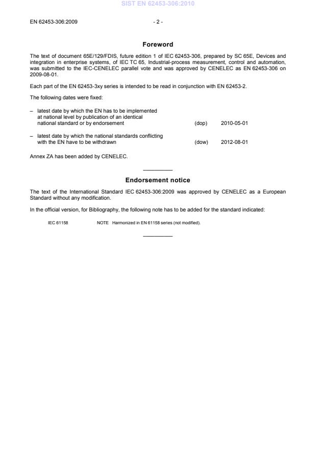 2012-08-01 Annex ZA has been added by CENELEC. __________ Endorsement notice The text of the International Standard IEC 62453-306:2009 was approved by CENELEC as a European Standard without any modification. In the official version, for Bibliography, the following note has to be added for the standard indicated: IEC 61158 NOTE