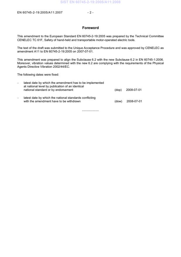 This amendment A11 modifies the European Standard EN 60745-2-19:2005; it was approved by CENELEC on