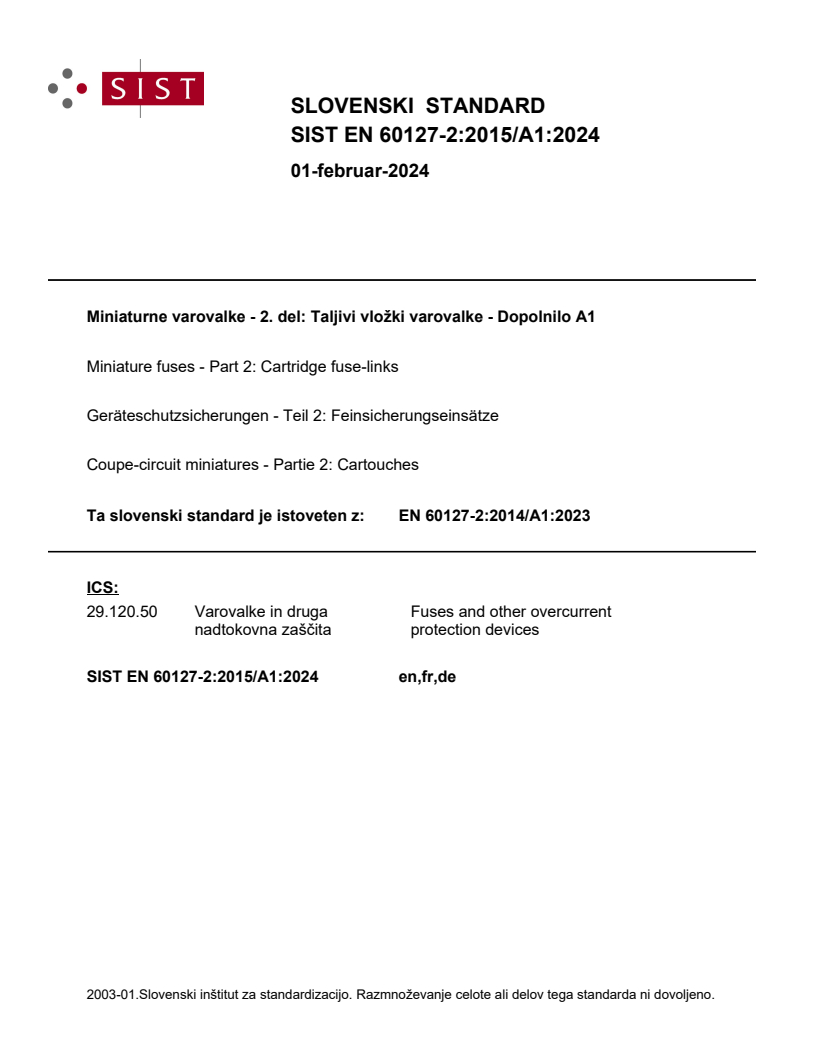 Miniaturne varovalke - 2. del: Taljivi vložki varovalke - Dopolnilo A1