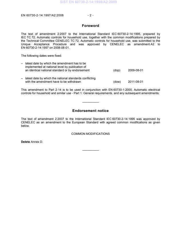 This amendment A2 modifies the European Standard EN 60730-2-14:1997; it was approved by CENELEC on
