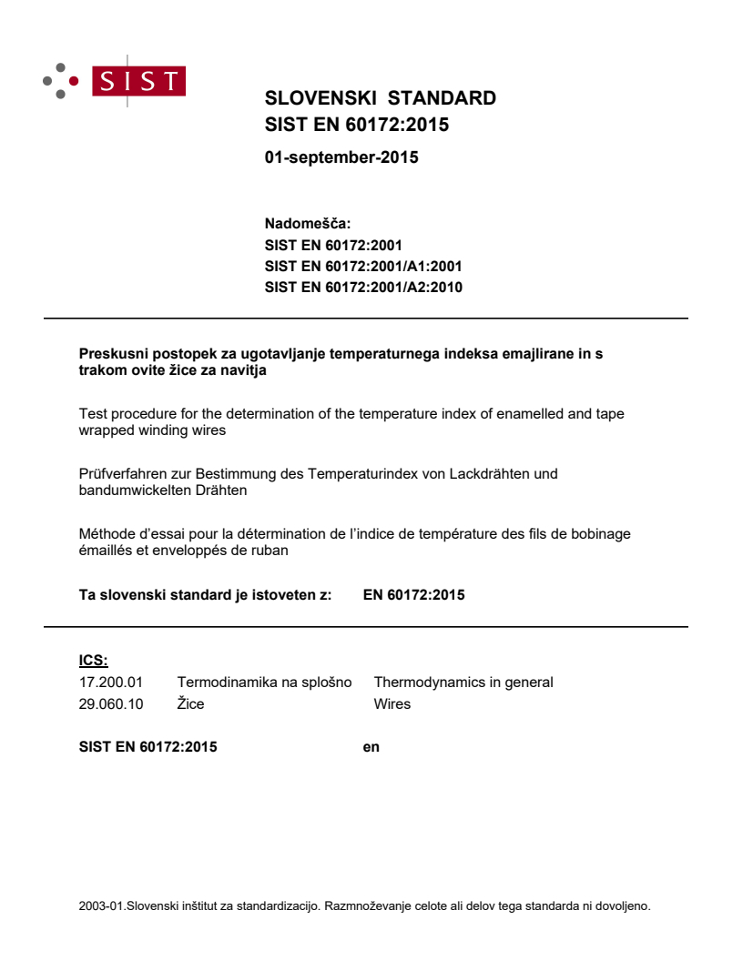 Ta mednarodni standard v skladu z določbami standarda IEC 60216-1 določa metodo za vrednotenje temperaturnega indeksa emajlirane žice, premazane z impregnacijskim premazom ali ne, in traku, ovitega okrog pravokotne žice, v zraku pri atmosferskem tlaku z rednim spremljanjem sprememb v odziv na preskuse napetosti. Ta postopek se ne uporablja za žico, izolirano z vlakni, ali žico, prekrito s trakovi, ki vsebuje anorganska vlakna.