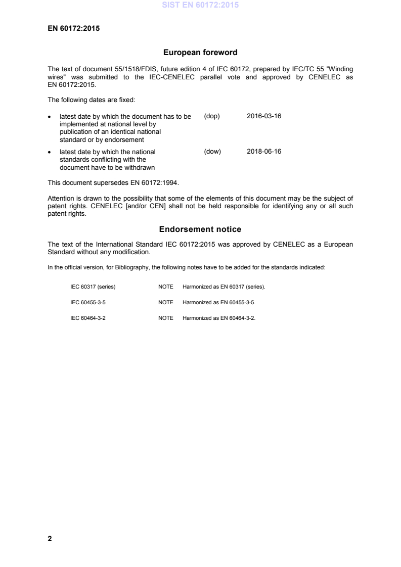 EN 60172:2015 is a standard published by CLC. Its full title is "Test procedure for the determination of the temperature index of enamelled and tape wrapped winding wires". This standard covers: IEC 60172:2015 specifies, in accordance with the provisions of IEC 60216-1, a method for evaluating the temperature index of enamelled wire, varnished or unvarnished with an impregnating agent, and of tape wrapped round and rectangular wire, in air at atmospheric pressure by periodically monitoring changes in response to AC proof voltage tests. This procedure does not apply to fibre-insulated wire or wire covered with tapes containing inorganic fibres. This fourth edition cancels and replaces the third edition published in 1987, Amendment 1:1997 and Amendment 2:2010. This edition constitutes a technical revision. This edition includes the following significant technical changes with respect to the previous edition: - Revision of Clause 1, Scope, to incorporate appropriate text from former Clause 2, Object; - Deletion of Clause 2, Object, by placement of its text into existing clauses; - New Clause 2, Normative references; - Revision of 5.1.1, 5.3 and 5.4 with corrections to Amendment 2 to the third edition; - Revision of Clause 7 as to clarify which specimens comply with Table 3 and Table 4; - Revision of figures with high-resolution photos and graphs. Keywords: enamelled wire, tape wrapped round and rectangular wire, AC proof voltage tests