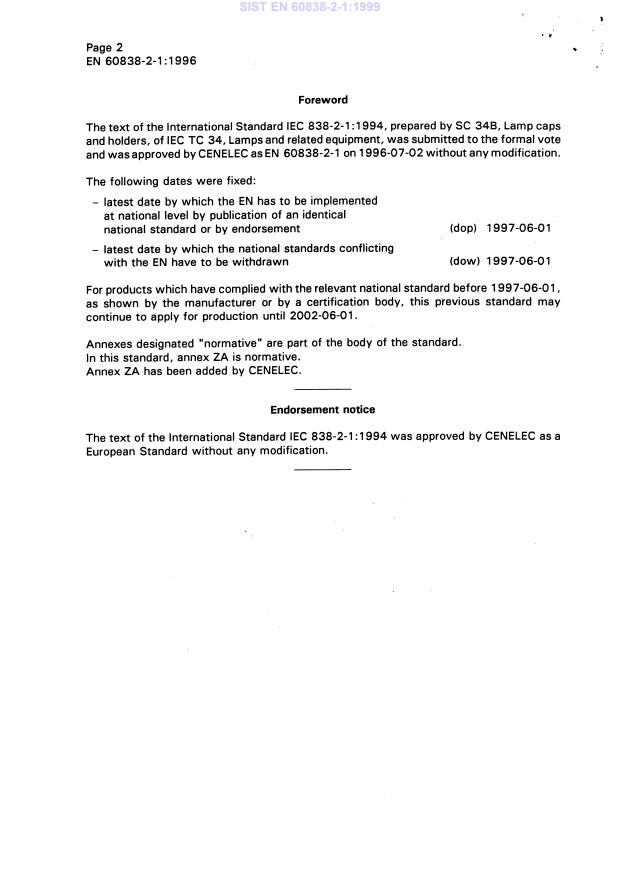 EN 60838-2-1:1996 has the following relationships with other standards: It is inter standard links to ISO 4046:1978, ISO 2081:1986, EN ISO 3743-1:1995, EN 12540:2000, EN 60598-1:1993, HD 323.2.20 S3:1988, EN 60529:1991, EN 60061-3:1993, EN 60695-2-2:1994, EN 60061-1:1993, EN 60061-2:1993, HD 214 S2:1980, EN 60838-2-1:1996/A2:2004, EN 60838-2-1:1996/A1:1998. Understanding these relationships helps ensure you are using the most current and applicable version of the standard.