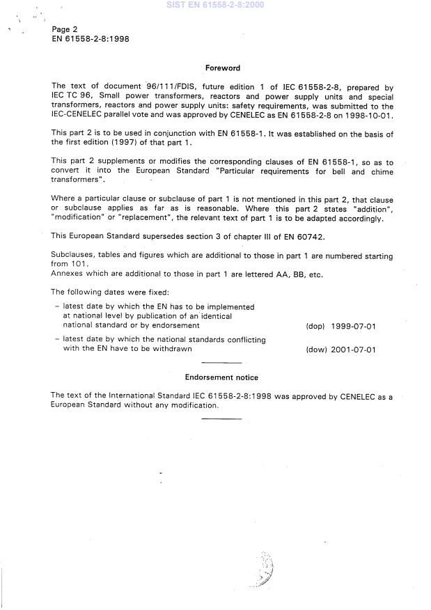 EN 61558-2-8:1998 is a standard published by CLC. Its full title is "Safety of power transformers, power supply units and similar - Part 2-8: Particular requirements for bell and chime transformers". This standard covers: Applies to fixed, single-phase, air-cooled independant or associated safety isolating transformers. This part 2 supplements or modifies the corresponding clauses in EN 61558-1. It has the status of a group safety publication in accordance with IEC Guide 104.