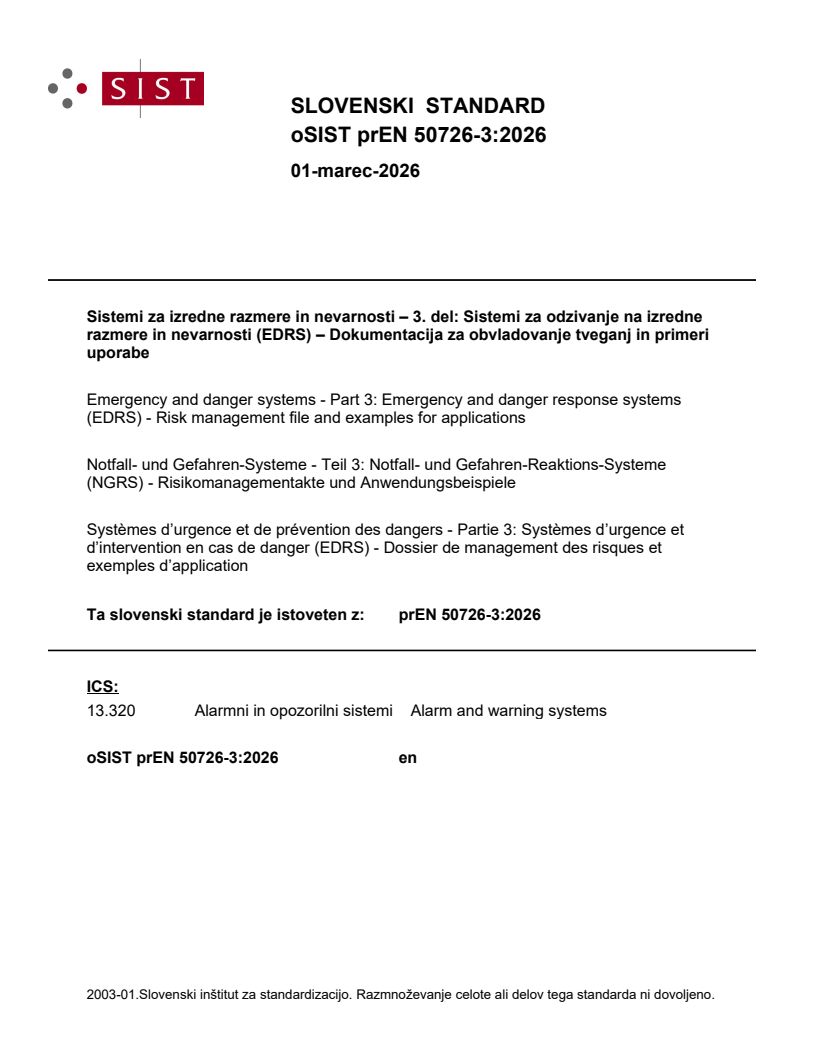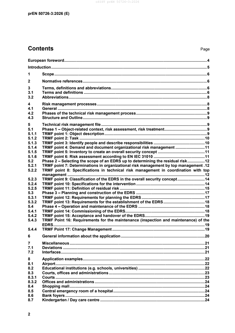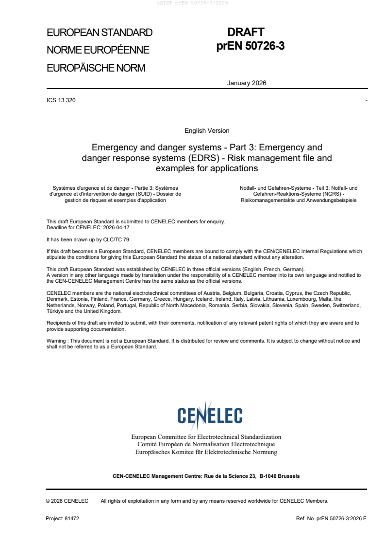 prEN 50726-3:2026 is a draft published by CLC. Its full title is "Emergency and danger systems - Part 3: Emergency and danger response systems (EDRS) - Risk management file and examples for applications". This standard covers: This document specifies the structure, construction, content and sequence of a technical risk management process and the technical risk management file in accordance with EN 50726-1. It also describes application examples for technical risk management according to EN 50726-1. An emergency and danger response system (EDRS) is used to minimize risks to life and limb. Its purpose is to report, verify and manage emergencies and dangers in order to prevent or limit personal injury. As already mentioned in the scope of application of EN 50726-1, the implementation of the Occupational Safety and Health Act and the subsequent regulations is intended in order to take particular account of the protection objective defined therein (physical integrity). However, this not only includes a risk assessment (e.g. prevention of acts of violence) for employees, but also for everyone in the property. The requirements of the Occupational Safety and Health Act are therefore intended to be observed when creating a safety concept and as part of the technical risk management process. Consequently, particular attention is drawn to paragraphs 5, 6 and 9 of the Occupational Safety and Health Act. Risks to life and limb can include emergencies and dangerous situations that can cause psychological or physical harm to people. As soon as the top management (e.g. operators, entrepreneurs, companies, approving authorities, building authorities, administrations) of a property has identified such risks to life and limb as part of risk management or similar risk assessments and/or independently became aware of them, this falls within the scope of EN 50726-1.