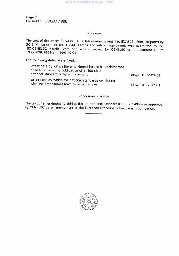 EN 60809:1996/A1:1996 is a amendment published by CLC. Its full title is "Lamps for road vehicles - Dimensional, electrical and luminous requirements". This standard covers: EN following parallel vote