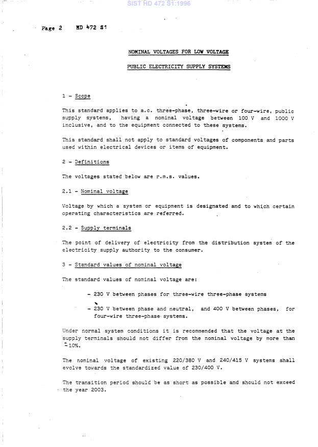 HD 472 S1:1989 is a standardization document published by CLC. Its full title is "Nominal voltages for low-voltage public electricity supply systems". This standard covers: Applies to: a.c. transmission, distribution and utilization systems and equipment with standard frequencies 50 Hz and 60 Hz and a nominal voltage above 100 V; a.c. and d.c. traction systems; a.c. and d.c. equipment with nominal voltages below 120 V a.c. or below 750 V d.c.