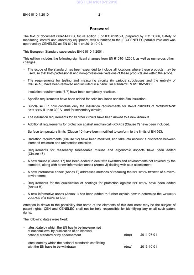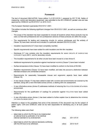 EN 61010-1:2010 is a standard published by CLC. Its full title is "Safety requirements for electrical equipment for measurement, control, and laboratory use - Part 1: General requirements". This standard covers: IEC 61010-1:2010 specifies general safety requirements for the following types of electrical equipment and their accessories, wherever they are intended to be used. a) Electrical test and measurement equipment b) Electrical industrial process-control equipment c) Electrical laboratory equipment This third edition cancels and replaces the second edition published in 2001. It constitutes a technical revision. This edition includes the following significant changes from the second edition, as well as numerous other changes. - The scope of the standard has been expanded to include all locations where these products may be used, so that both professional and non-professional versions of these products are within the scope. - The requirements for testing and measuring circuits (in various subclauses and the entirety of Clause 16) have been removed and included in a particular standard IEC 61010-2-030. - Insulation requirements (6.7) have been completely rewritten. - Additional requirements for protection against mechanical HAZARDS (Clause 7) have been included. - Surface temperature limits (Clause 10) have been modified to conform to the limits of EN 563. - Radiation requirements (Clause 12) have been modified, and take into account a distinction between intended emission and unintended emission. - Requirements for reasonably foreseeable misuse and ergonomic aspects have been added (Clause 16). - A new clause (Clause 17) has been added to deal with HAZARDS and environments not covered by the standard, along with a new informative annex (Annex J) dealing with RISK assessment. - A new informative annex (Annex E) addresses methods of reducing the POLLUTION DEGREE of a micro-environment. - Requirements for the qualification of coatings for protection against POLLUTION have been added (Annex H). - A new informative annex (Annex I) has been added to further explain how to determine the WORKING VOLTAGE of a MAINS CIRCUIT. It has the status of a group safety publication, as specified in IEC Guide 104. The contents of the corrigendum 1 of May 2011, the interpretation sheet 1 of February 2013 and the corrigendum 2 of October 2013 have been included in this copy.