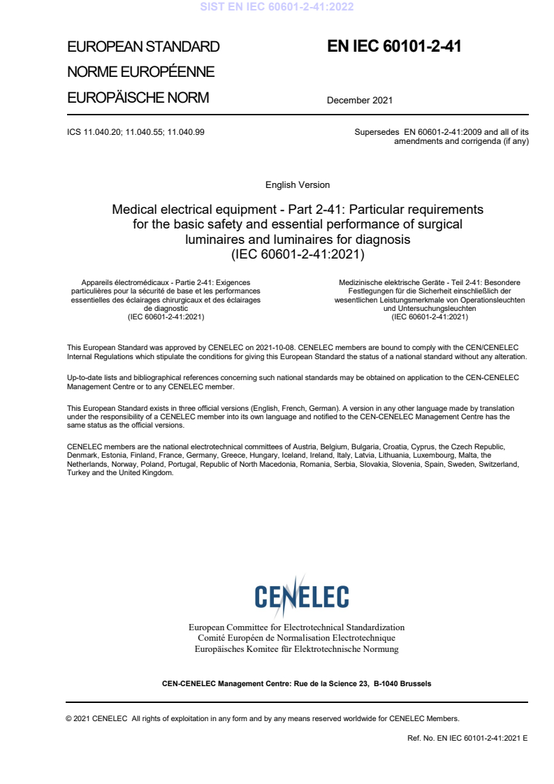 EN IEC 60601-2-41:2021 (identical to IEC 60601-2-41:2021) defines the basic safety and essential performance requirements for surgical luminaires and luminaires for diagnosis as medical electrical equipment (ME EQUIPMENT). This third edition is a technical revision that replaces the 2009 edition and its amendments and clarifies that when a clause is not explicitly limited to ME EQUIPMENT or ME SYSTEMS it applies to both, as relevant.