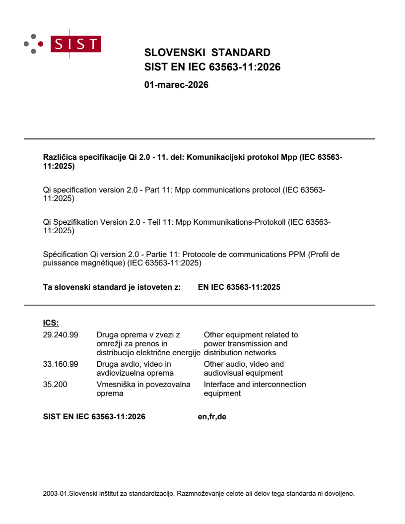 Različica specifikacije Qi 2.0 - 11. del: Komunikacijski protokol Mpp (IEC 63563-11:2025)