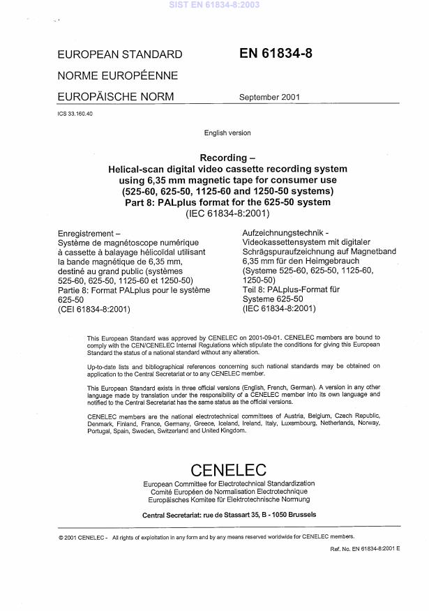- EN/IEC 61834 series (digital video cassette recording systems) - EN 61834-8:2001 is one part of this family.