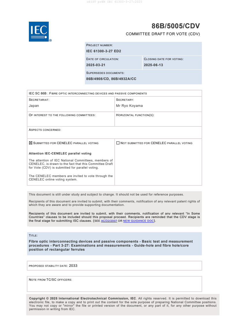 IEC CDV 61300-3-27/Ed2 IEC 2025 10 86B/5005/CDV