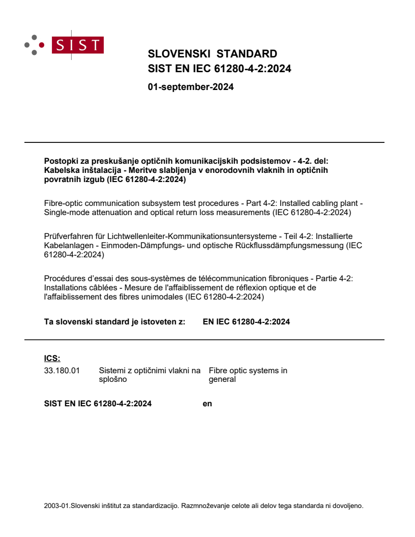 IEC 61280-4-2:2024 is available as IEC 61280-4-2:2024 RLV which contains the International Standard and its Redline version, showing all changes of the technical content compared to the previous edition.IEC 62180-4-2:2024 is applicable to the measurements of attenuation and optical return loss of an installed optical fibre cabling plant using single-mode fibre. This cabling plant can include single-mode optical fibres, connectors, adapters, splices, and other passive devices. The cabling can be installed in a variety of environments including residential, commercial, industrial and data centre premises, as well as outside plant environments. This document is applicable to all single-mode fibre types including those designated by IEC 60793-2-50 as Class B fibres. The principles of this document can be applied to cabling plants containing branching devices (splitters) and at specific wavelength ranges in situations where passive wavelength selective components are deployed, such as WDM, CWDM and DWDM devices. This document is not intended to apply to cabling plants that include active devices such as fibre amplifiers or dynamic channel equalizers. This third edition cancels and replaces the second edition published in 2014. This edition constitutes a technical revision. This edition includes the following significant technical changes with respect to the previous edition: a) addition of the equipment cord method; b) addition of test limit adjustment related to test cord grades; c) refinements on measurement uncertainties.