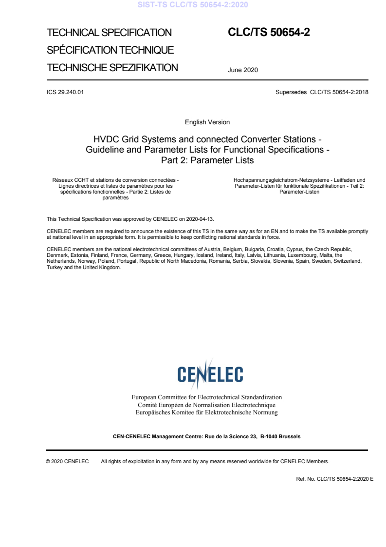 CLC/TS 50654-2:2020 is a technical specification published by CLC. Its full title is "HVDC Grid Systems and connected Converter Stations - Guideline and Parameter Lists for Functional Specifications - Part 2: Parameter Lists". This standard covers: 1.1 General These Guidelines and Parameter Lists to Functional Specifications describe specific functional requirements for HVDC Grid Systems. The terminology "HVDC Grid Systems" is used here describing HVDC systems for power transmission having more than two converter stations connected to a common DC circuit. While this document focuses on requirements, that are specific for HVDC Grid Systems, some requirements are considered applicable to all HVDC systems in general, i.e. including point-to-point HVDC systems. Existing IEC, Cigré or other documents relevant have been used for reference as far as possible. Corresponding to electric power transmission applications, this document is applicable to high voltage systems, i.e. only nominal DC voltages equal or higher than 50 kV with respect to earth are considered in this document. NOTE While the physical principles of DC networks are basically voltage independent, the technical options for designing equipment get much wider with lower DC voltage levels, e.g. in case of converters or switchgear. Both parts have the same outline and headlines to aid the reader. 1.2 About the present release The present release of the Guidelines and Parameter Lists for Functional Specifications describes technical guidelines and specifications for HVDC Grid Systems which are characterized by having exactly one single connection between two converter stations, often referred to as radial systems. When developing the requirements for radial systems, care is taken not to build up potential showstoppers for meshed systems. Meshed HVDC Grid Systems can be included into this specification at a later point in time. The Guidelines and Parameter List to the Functional Specification of HVDC Grid Systems cover technical aspects of: - coordination of HVDC grid and AC systems - HVDC Grid System characteristics - HVDC Grid System control - HVDC Grid System protection - AC/DC converter stations - HVDC Grid System installations, including DC switching stations - models and validation - HVDC Grid System integration tests Beyond the present scope, the following content is proposed for future work: - transmission lines and transition stations - DC/DC converter stations - DC line power flow controllers