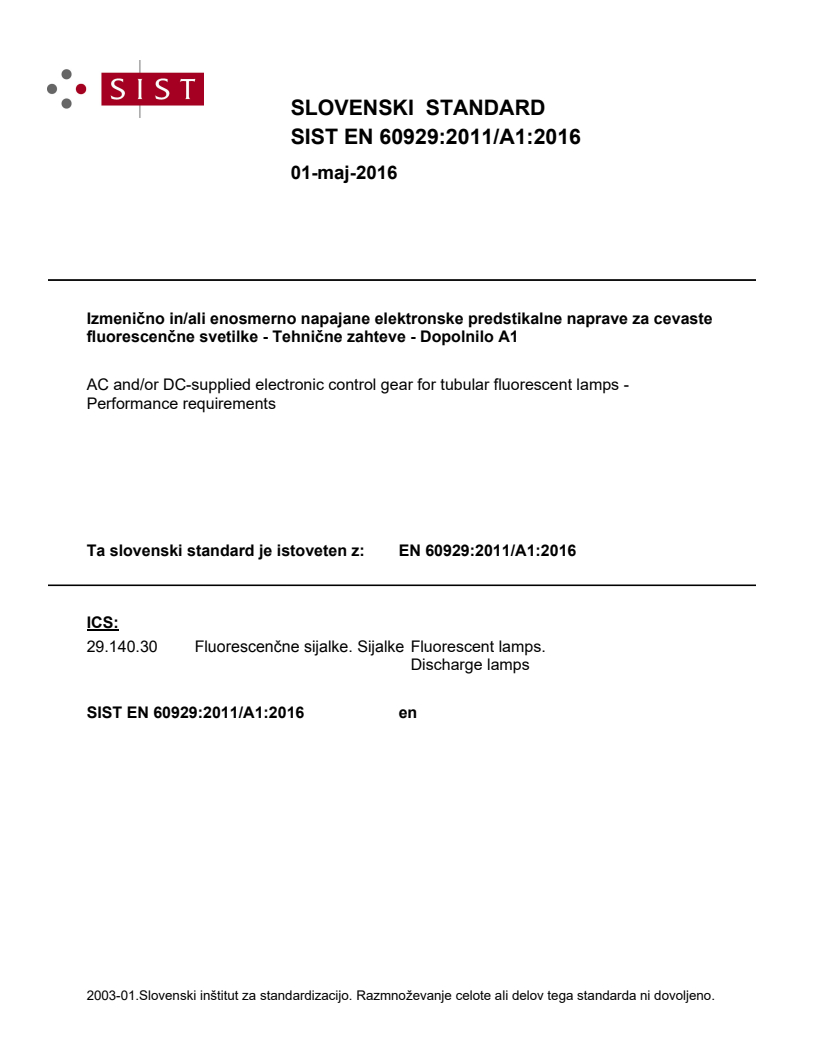 EN 60929:2011/A1:2016 is a amendment published by CLC. Its full title is "AC and/or DC-supplied electronic control gear for tubular fluorescent lamps - Performance requirements". This standard covers: This international Standard specifies performance requirements for electronic control gear for use on a.c. at 50 Hz or 60 Hz and/or d.c. supplies, both up to 1 000 V, with operating frequencies deviating from the supply frequency, associated with fluorescent lamps as specified in IEC 60081 and IEC 60901, and other fluorescent lamps for high-frequency operation. NOTE 1 Tests in this standard are type tests. Requirements for testing individual control gear during production are not included. NOTE 2 There are regional standards regarding the regulation of mains current harmonics and immunity for endproducts like luminaires and independent control gear. In a luminaire, the control gear is dominant in this respect. Control gear, together with other components, should comply with these standards.