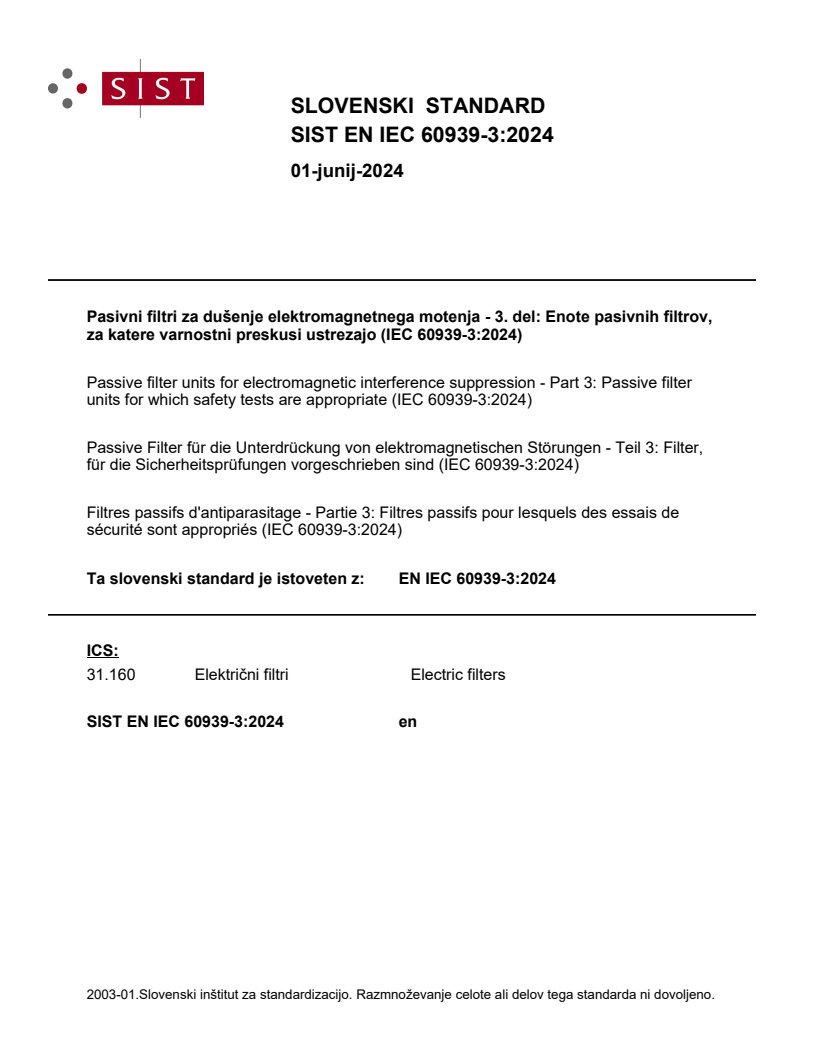 Pasivni filtri za dušenje elektromagnetnega motenja - 3. del: Enote pasivnih filtrov, za katere varnostni preskusi ustrezajo (IEC 60939-3:2024)