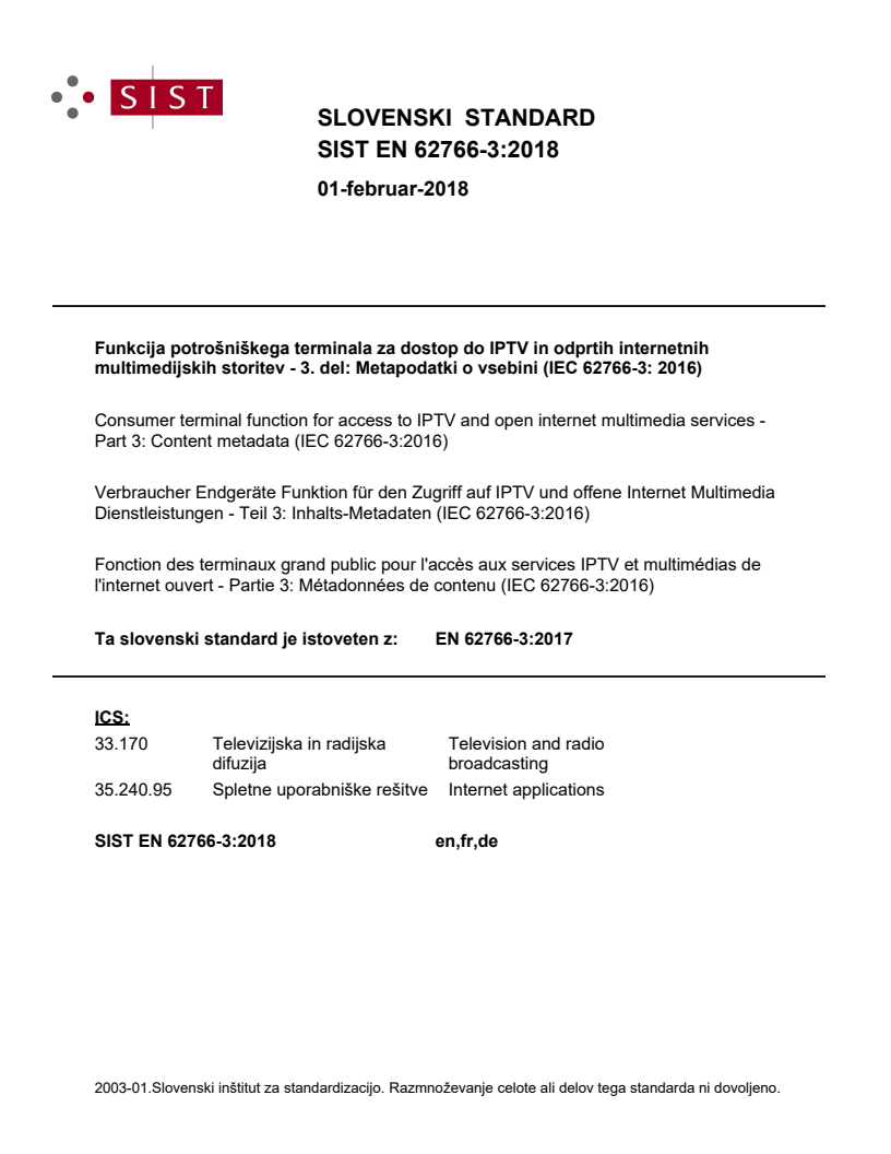 Funkcija potrošniškega terminala za dostop do IPTV in odprtih internetnih multimedijskih storitev - 3. del: Metapodatki o vsebini (IEC 62766-3: 2016)
