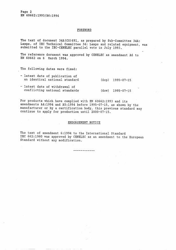 EN 60662:1993/A6:1994 is a amendment published by CLC. Its full title is "High-pressure sodium vapour lamps". This standard covers: EN following parallel vote * Superseded by EN 60662:2012