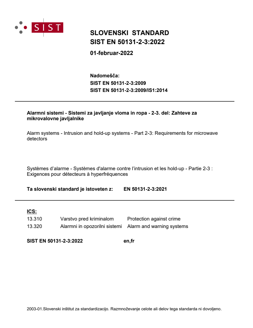 Ta slovenski standard je istoveten z: EN 50131-2-3:2021